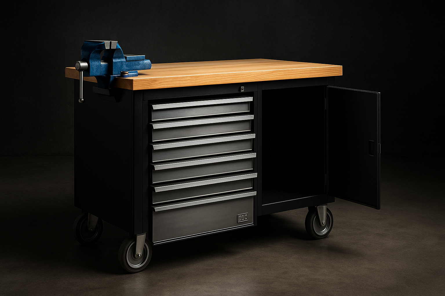Bancada móvel com 6 gavetas e 1 porta, Tampo de madeira 40mm, acompanha Suporte e Morsa